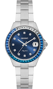 Analógico Gênero: Feminino Visor: Azul Vidro: cristal de safira Funções: calendário, cristais, mostrador sunray Pressão: 50m Características: com caixa em aço e pulseira em aço Diâmetro da caixa: 33 mm Preço sugerido: R$ 898,00