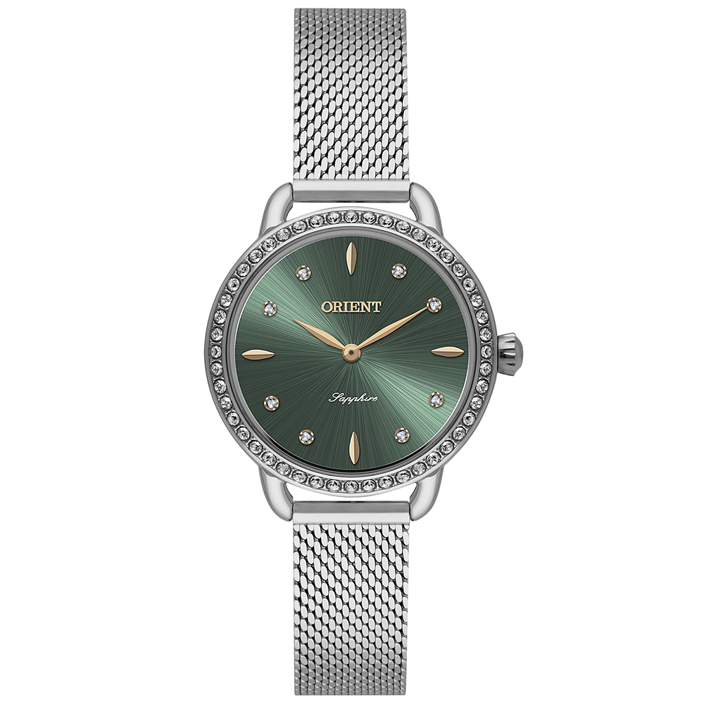 Analógico Gênero: Feminino Visor: Azul e verde Vidro: cristal de safira Funções: decorado com cristais da swarovski® Pressão: 30m Características: com caixa em aço e pulseira tipo mesh em aço Diâmetro da caixa: 30,5 mm Preço sugerido: R$ 798,00