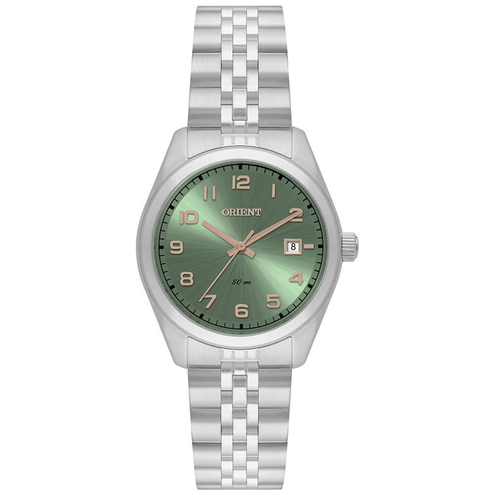 Analógico Gênero: Feminino Visor: Verde, roxo e azul Vidro: cristal mineral Funções: calendário, mostrador sunray Pressão: 50m Características: com caixa em aço e pulseira em aço Diâmetro da caixa: 31,5 mm Preço sugerido: R$ 398,00