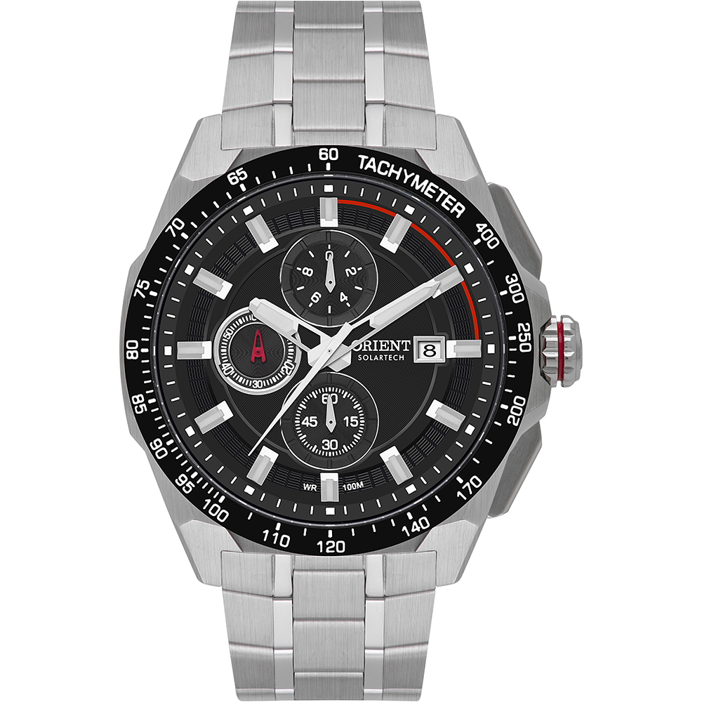 Funções: solartech com autonomia de 5 meses, taquímetro, indicador am/pm, calendário, mostrador em camadas